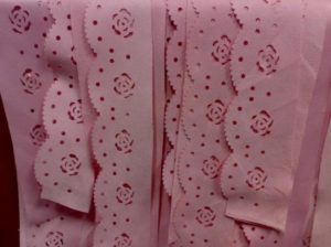 傳統的切割機在生產切割中經常會遇到一些這樣的問題,如切口粗糙,造成邊緣毛邊現像,同時也給下道工序造成了不便,嚴重影響了服裝的質量,大大降低了市場競爭力。布料激光切割機切出來的產品不發黃,不散邊能自動收邊,而且不會變形,尺寸精確效果柔軟。任意的復雜圖形,形狀大小的花邊,通過電腦軟件程序設計圖形,都可以切割出來。
