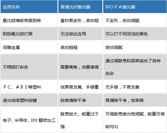除了以上的幾個應用案例外,MOPA激光器與普通光纖激光器還存在很多不同的應用差別,在這里列舉了一部分典型的應用案例,如下表格: